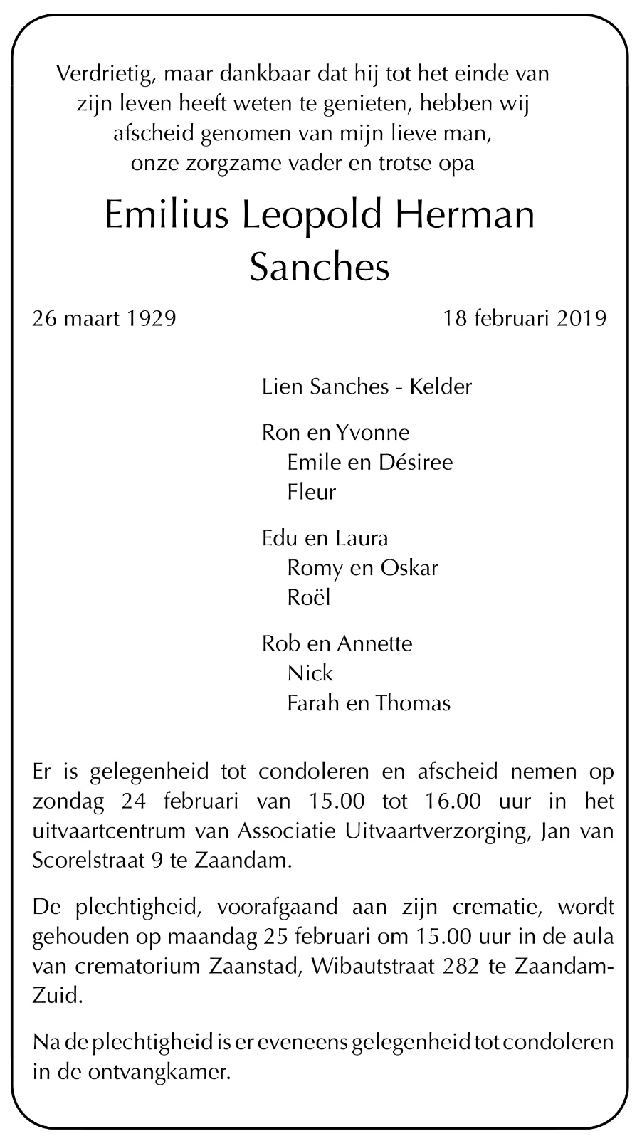 Vanmorgen bereikte ons het trieste bericht dat Emilius Leopold Herman Sanchez (26/03/1929) op 18 februari is overleden.